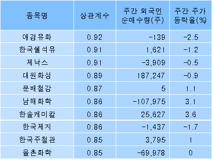 다음은 소재 업종 중 외국인 120일 보유수량과 주가의 상관 계수가 높게 나타난 종목들로 애경유화(상관계수: 0.92), 한국쉘석유(0.91), 제낙스(0.91) 등이 있다. 상관 계수의 값은 -1에서 1 사이의 값을 가질 수 있는데, 0.7과 1 사이이면 두 변수가 강한 양의 선형관계가 있다고 해석된다.