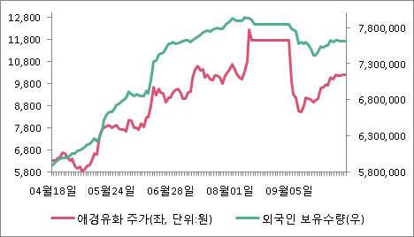 특히 애경유화 주가와 상관계수는 0.92로 동업종 중 가장 높은 상관성을 보였다. 최근 1주일 동안 해당 종목의 외국인 순매도량은 139주로 매도 추세가 약하게 나타나고 있다.