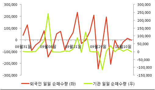 다음 표는 동종목의 외국인, 기관의 일별 순매수량을 나타낸 것이다.