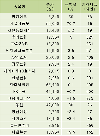 19일 인디에프(014990), 서울식품우(004415), 신원종합개발(017000), 우리은행(000030), 한화3우B(00088K), 에이테크솔루션(071670)등이 장중 52주 신고가를 경신했다.