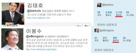 | ▲ 경남 김해을 재보선의 한나라당 김태호 후보(위)와 국민참여당 이봉수 후보(아래)의 트위터. 김태호 후보의 트위터 팔로워 수가 이봉수 후보보다 5배 정도 많다. |