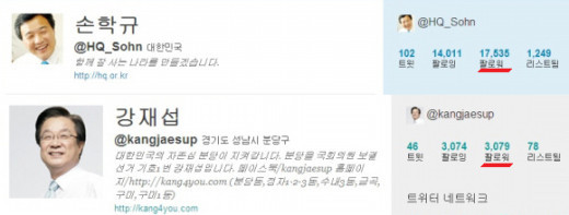 | ▲ 분당을 지역의 민주당 손학규(위) 후보와 한나라당 강재섭(아래) 후보의 트위터. 손학규 후보가 1만 7535명으로 강재섭 후보보다 팔로워가 더 많다. |