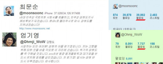 | ▲ 강원도지사 민주당 최문순 후보(위)와 한나라당(아래) 엄기영 후보의 트위터. 최문순 후보의 트위터 팔로워 수가 5배 정도 많다. |