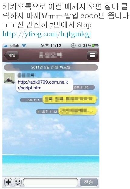 한 네티즌은 25일 트위터를 통해 “카카오톡으로 http://adk9799.com.ne.kr/script.htm란 메시지가 올 경우 절대 클릭하면 안된다”는 경고를 전했다.