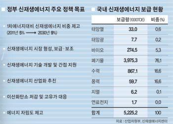 아울러 신재생에너지별 보급편차도 심하다. 우리나라 신재생에너지 보급량 중 폐기물을 활용한 에너지의 비중이 76.1%로 가장 높고 전 세계적인 시장 형성이 돼 있는 태양열과 풍력의 보급량은 각각 0.6%와 풍력 1.1%에 그치고 있는 실정이다.