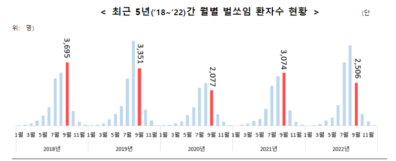 행정안전부 2023년 9월 7일자 '추석 전 벌초, 벌쏘임·예초기 사고 주의!' 보도자료 내 2018~2022년간 월별 벌 쏘임 환자 수 현황. ⓒ그래픽 HIRA빅데이터개방포털, 건강보험심사평가원, 행정안전부 제공