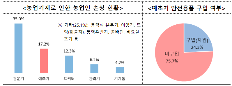 행정안전부 2023년 9월 7일자 '추석 전 벌초, 벌쏘임·예초기 사고 주의!' 보도자료 내 농업기계로 인한 농업인의 손상 현황 및 예초기 안전용품 구입 여부 그래프. ⓒ그래프 농촌진흥청의 , 행정안전부 제공
