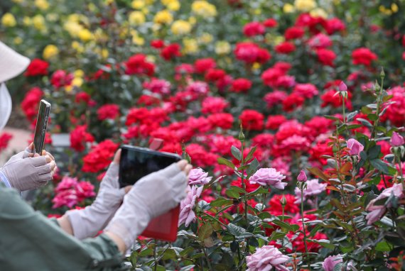 5일 오전 서울 송파구 올림픽공원 장미광장에서 열린 '2022 로즈아워 페스타'에서 관람객들이 활짝 핀 장미를 찍고 있다. ⓒ사진 2022년 10월 5일 뉴시스