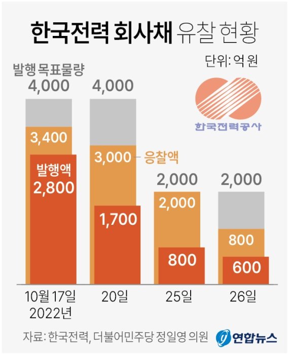 회사채 시장에선 초유의 사태가 벌어집니다. 초우량 공채로 평가받는 한국전력과 한국도로공사의 채권 발행이 흥행에 실패합니다. 한국전력공사는 2년 만기 회사채 2천억원어치를 발행할 계획이었으나 물량을 다 채우지 못하고 600억원어치를 발행하는 데 그칩니다. 발행 금리는 5.9%로 6%대에 육박했죠. 이는 2008년 11월 이후 14년 만에 최고치입니다. 한전채 미달사태는 기업 자금조달 시장에 공포를 키웠습니다.