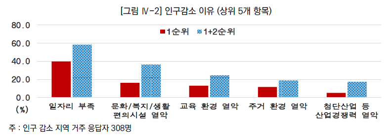 '지역의 인구가 감소하는 이유'에 대한 응답으로 '일자리 부족'이 1위를 차지했는데요.