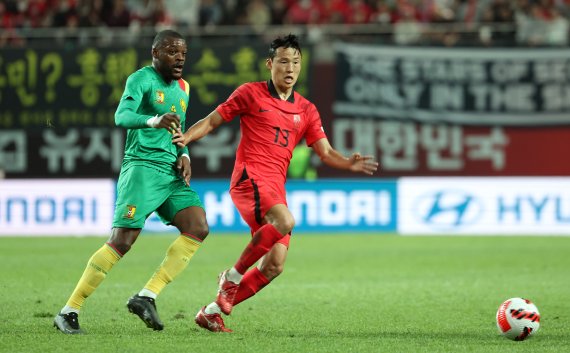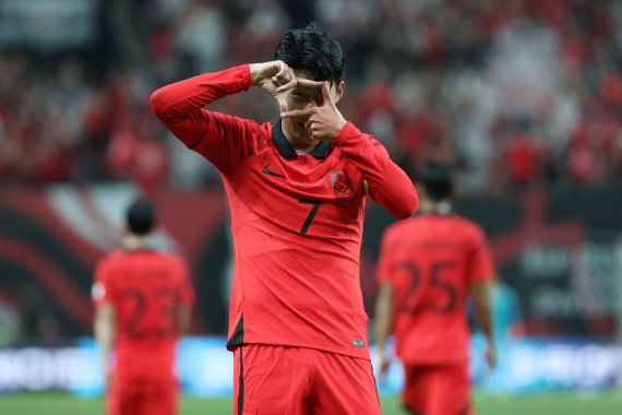 축구 국가대표 평가전 대한민국과 카메룬의 경기에서 선제골을 성공시킨뒤 세리머니를 하고 있는 손흥민 선수 ⓒ 뉴스1 2022년 9월