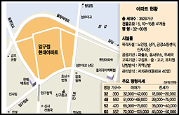 ◇단지현황=강남구 압구정1동에 자리잡고 있는 현대아파트는 10∼15층 41개동 총 3529가구로 이뤄진 대단지다.대지면적은 7만6115평,건축연면적만 16만2930평에 달한다.평형은 32,35,43,48,52,54,65,80평형 등 8개로 평균 면적이 50평인 대형아파트 단지다.현대건설이 보유한 65동(455가구)은 직원용 숙소로 사용되고 있다.