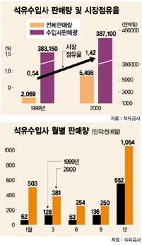 ◇시장 잠식 가속화=11일 한국석유공사가 분석한 ‘2000년 석유수입사 영업실적’에 따르면 석유수입업체들의 지난해 매출은 2.5배 급증했고 이에 따라 시장점유율도 99년 0.54%에서 지난해 1.42%로 높아졌다. 수치상으로는 아직 낮지만 1년 사이에 시장점유율이 3배 가까이 치솟은 것은 수입업체들이 사실상 과점체제인 석유시장을 본격적으로 흔들기 시작했다는 ‘신호’로 받아들여지고 있다.