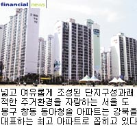 ◇단지분위기 및 현황=창동 동아청솔아파트는 도봉구의 랜드마크격 아파트로 꼽히고 있는 만큼 멀리서도 이곳이 창동지역 대표 아파트 다운 모습이 한눈에 들어온다. 단지 입구부터 넓고 가지런히 정돈된 느낌이다.