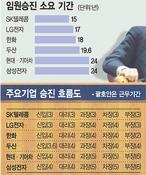삼성전자와 현대·기아차의 경우 24년이 소요되고 한화는 18년, 두산은 19.6년이 돼야 임원 승격 심사대상에 오른다.