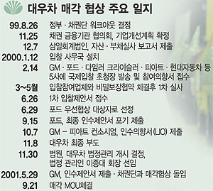 ◇워크아웃에서 양해각서(MOU) 체결까지=대우차는 99년 8월26일 워크아웃 시작 이후 지난해 11월8일 최종부도를 냈으나 노사가 노사협의회 합의문에 합의,같은 달 30일 법원에 의해 법정관리 개시 결정이 내려졌다.