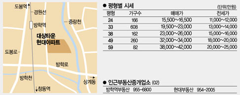 ◇입지여건=대상타운-현대아파트는 양옆에 북한산, 수락산이 자태를 자랑하고 단지 바로 옆에는 중랑천이 흐른다. 배산임수형 단지다. 지하철 1호선 방학역까지 걸어서 2∼3분 거리다. 차로 청량리까지는 25분, 서울역까지는 50분이면 도착이 가능하다. 마을버스를 이용하면 4호선 창동역과 7호선 노원역도 10분 안팎이다. 도봉로, 동부간선도로, 동일로 등과 인접해 자가용 이용자도 도심접근이 쉽다. 방학역을 경유하는 버스노선도 많은 편이다. 일반 시내버스 15·19·20·215·235-1번 등과 좌석버스 136·139·902번도 경유한다.