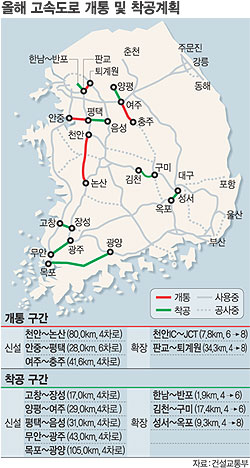 올해 착공하는 고속도로는 2007년 이전까지 총 6조800억원이 투입될 계획으로 경부선 한남∼반포간 확장노선과 김천∼구미간 확장노선은 상반기중, 나머지 6개 노선은 하반기에 착공할 계획이다.