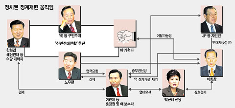 ‘정계개편’을 둘러싸고 정치권이 요동치고 있다. 민주당 노무현 대통령 후보는 김영삼 전대통령(YS)을 만나는 것을 시작으로 자신의 ‘신민주대연합’ 구상을 구체화하는 작업에 착수했다. 사실상 한나라당 대통령 후보로 확정된 이회창 후보는 ‘노무현발 정계개편’에 촉각을 곤두세우면서도 여야를 초월한 보수세력의 결집을 통한 ‘역 정계개편’을 제안하며 맞불을 놓고 있다. 박근혜 의원과 자민련 김종필 총재의 발걸음도 빨라지고 있다.