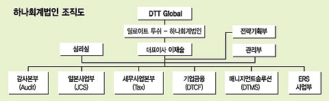 ◇짧은 역사, 그러나 단단한 경쟁력=하나는 짧은 역사에도 불구하고 회계전문가들의 팀워크로 탄탄한 조직을 구성하고 있다. 감사본부, 세무사업본부, 일본사업부 등 기본적인 조직은 물론 DTMS, DTCF, 위험관리(ERS) 등 부가가치를 창조할 수 있는 조직이 잘 혼재돼 있다.