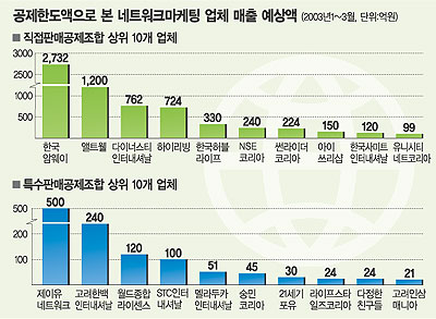 우리나라 네트워크 마케팅시장 매출 순위는 한국암웨이가 독주하고 있는 가운데 앨트웰, 다이너스티 인터내셜날 등 선두권 업체들이 뒤따라가는 형태를 보이고 있는 것으로 나타났다. 또 직접판매공제조합 소속 상위 10개사의 매출이 특수판매공제조합 전체 회원사의 매출 금액보다 무려 4배 이상 높은 것으로 조사돼 두 공제조합간의 차이를 극명하게 보여 주고 있다.