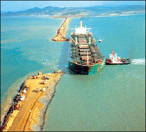 이때 정회장의 머리 속에 떠오른 것이 고철로 쓰려고 울산에 정박시켜 놓았던 23만t급 폐유조선을 이용하는 것이었다. 폐유조선의 탱크 속에 바닷물을 채우고 가라앉혀 물의 흐름을 막은 다음 중장비를 동원, 바위덩어리를 쏟아부었다.