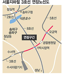 기본계획에 따르면 지하철 3호선 연장공사는 종점역인 수서역에서 8호선 가락시장역∼경찰병원역(신설)∼5호선 오금역을 연결하는 것으로 올해 연말께 본격 착공된다. 이 사업은 서울시 지하철공사가 시행하며 사업비는 총 4397억원(국비 1759억원,서울시 예산 2638억원)이 투입된다.