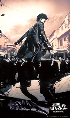 ‘조폭마누라2’는 시작부터 현란하다. 도심 고층건물 옥상에서 난투극을 벌이던 가위파가 열세에 몰릴 무렵, 차은진(신은경)이 헬리콥터에서 줄을 타고 내려와 전세를 역전시킨다. 그러나 총을 든 무리들이 가세해 총격전이 벌어지면서 차은진은 총상을 입고 건물로 추락한다. 그녀의 얼굴이 클로즈업되면서 주위의 파편들이 정지된 듯 천천히 떨어지는 이 장면은 마치 ‘매트릭스2리로디드’의 한 장면을 보는 것과 같은 착각을 불러일으킨다.