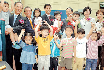 김승유 하나 은행장(윗줄 왼쪽 두번째)과 송자 대교 회장(세번째), 신재철 한국IBM 사장(다섯번째)이 어린이들과 기념촬영을 하고 있다.