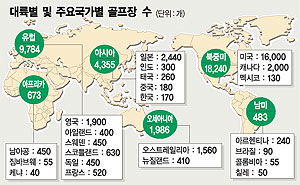 대륙별로 미국과 캐나다가 속해 있는 북중미가 1만8240개로 가장 많다. 이 가운데 쿠바와 엘살바도르에는 각각 2개씩의 골프장이 있는 것으로 조사됐다. 이어서 유럽(9784개), 아시아(4355개), 오세아니아(1986개), 아프리카(673개), 남미(483개) 등 순이다.