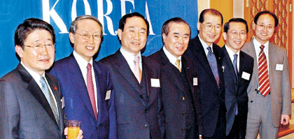 한국 최고경영자(CEO)포럼은 2일 서울 장충동 호텔신라에서 정기 세미나를 갖고 올해 경제전망에 대한 토론을 가졌다. 왼쪽부터 홍성일 한투증권 사장, 김종창 금융통화위원, 강석진 CEO컨설팅 회장, 유상옥 코리아나화장품 회장, 윤병철 우리금융그룹 회장, 정광선 중앙대 교수, 최영상 베어링포인트 한국대표.