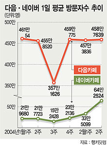 네이버는 다음 카페를 겨냥해 “있을때 잘하지 그랬어∼안녕” “난 네이버 카페로 간다” 등의 공격적인 광고내용으로 네티즌들을 효과적으로 공략해 이번달 둘째주(8∼14일)에는 1일 평균 방문자수 64만명을 기록하며 전주대비 92% 증가했다.