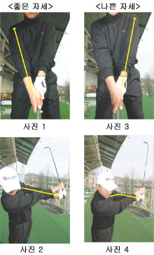 (사진4) 임팩트시 클럽이 열리는 문제점 때문에 임팩트시 왼팔이 접히면서 클럽이 열리지 않도록 해주는 동작으로 힘의 손실을 가져와 비거리가 짧아진다. 또한 몸이 왼편으로 기울면서 임팩트를 맞이하려는 경향이 생긴다.