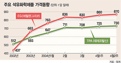 이에 따라 고순도 테레프탈산(TPA)와 에틸렌그리코(EG)의 가격은 지난해 중반보다 30%이상 올라, TPA는 지난해 말 t당 593달러였던 것이 지난달 708달러로 최근엔 730달러 까지 뛰었다. 또한 EG는 같은 기간 668달러(t당)에서 830달러, 870달러까지 폭등했다. 게다가 파라자일렌(PX)은 공급부족 현상을 보이고 있다.