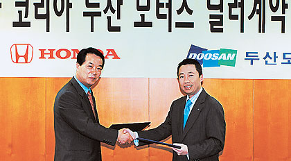 두산모터스㈜는 12일 두산타워에서 혼다코리아와 딜러 계약을 체결했다.