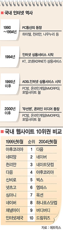 이때부터 등장한 PC방, 1997년 이후 등장한 ‘다음’, ‘네이버’ 같은 포털 사이트들이 폭발적인 인기를 끌면서 인터넷 기반의 주요 산업으로 자리매김하기 시작했다. 또 1998년 등장한 다중온라인게임(MMORPG) ‘리니지’가 동시접속자 10만명을 넘어서며 온라인게임 붐이 일어났다.