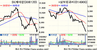 최근 자금경색 등의 루머에 휩싸이며 동반급락했던 삼보컴퓨터와 SK케미칼의 주가흐름이 22일에는 극명하게 엇갈렸다.