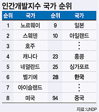 우리나라가 평균수명과 문자해독률, 1인당 국민소득 등을 종합평가한 인간개발지수(HDI) 순위에서 지난해보다 2계단 오른 세계 28위에 랭크됐다.
