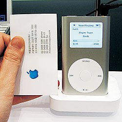 이번에 선보이는 아이팟미니는 크기는 명함 한장정도이지만 1000곡을 저장할 수 있는 4�l 용량에 5개의 다양한 색상이 특징으로 가격과 크기 등에서 경쟁력이 있다고 애플컴퓨터코리아측은 설명했다.
