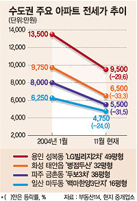21일 현지 중개업소들에 따르면 경기 용인·화성지역 아파트의 경우 연초 대비 전셋값이 38% 이상 떨어졌고 파주·일산지역도 같은 기간 20% 이상 떨어진 아파트가 수두룩하다.