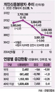 ◇사망자 제외시 순증…증가세 다시 ‘꿈틀’=은행연합회가 26일 내놓은 ‘10월말 현재 신용불량정보 관리현황’을 보면 10월말 현재 신용불량자는 365만6585명으로 전달에 비해 4574명(-0.12%) 줄었다.