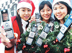 모토로라코리아가 16일 서울 동대문 두산타워 야외광장에서 개최한 초소형 슬라이드 MP3폰 ‘미니모토’(모델명 : MS400) 제품시연회에서 도우미들이 휴대폰을 선보이고 있다.