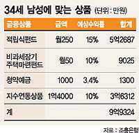◇30세 신혼부부의 15년내 10억만들기=지난달 결혼한 김씨부부는 월 소득이 평균 380만원으로 이중 300만원을 저축하고 80만원을 생활비로 사용할 예정이다. 45세까지 10억원을 모으기를 바라는 김씨 부부에게 재테크 전문가들은 장기주택마련저축과 상호저축은행의 정기적금을 활용하도록 권유했다. 장기주택마련저축에 월 62만5000원씩 매월 불입하면 연간 750만원을 넣게 되고 이 750만원의 40%인 300만원을 소득공제받을 수 있다.