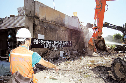 한국토지공사가 경기 성남 판교신도시 지구 미이주 가옥 철거에 대한 행정대집행 영장을 발부받아 23일 강제 철거 작업을 벌이고 있다.