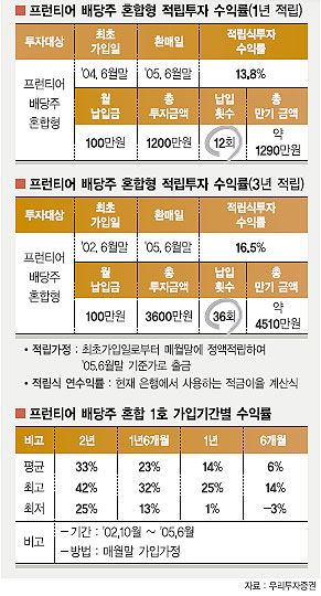실제 우리투자증권 ‘프런티어 배당주 혼합1호’의 가입기간별 수익률을 보면 2년 가입자의 평균수익률이 33%인 데 비해 1년 가입자는 14%, 6개월 가입자는 6%로 현격한 차이를 보였다.
