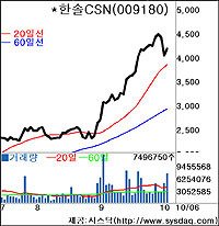 6일 코스피시장에서 한솔CSN의 주가는 전일보다 3.48% 오른 4160원에 거래를 마쳐 3일만에 오름세로 전환했다. 한솔CSN은 조정 분위기에 휩쓸려 장 초반 6%대의 급락세를 보였으나, 아웃소싱 물류서비스 수주 소식과 함께 상승세로 돌아섰다.