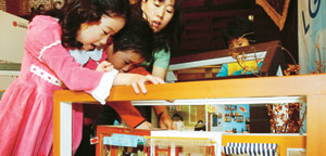 이날 출시회에 참석한 어린이들이 창호 프레임(틀)을 이용한 '소인국 마을 모형'을 신기한 듯 쳐다보고 있다.