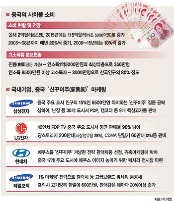 이에 따라 삼성, LG, 현대차 등 국내 기업들은 최대 구매력을 가진 ‘진링’, ‘신꾸이주’를 잡기위해 중국 현지 법인에 ‘신귀족 마케팅팀’ 등 별도 조직을 갖추고 공격적인 마케팅에 들어갔다.
