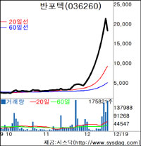반포텍은 장동건 소속사가 우회상장을 추진한다는 호재로 지난 1일부터 16일까지 12거래일 연속 상한가를 기록했다. 주가도 4015원에서 2만1150원으로 420%나 급등했다.