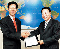 ‘First-Class 경제신문’ 파이낸셜뉴스는 26일 서울 여의도 본사에서 월정액의 기본료를 내면 휴대폰 시내통화료만으로 국제전화를 무제한으로 이용할 수 있는 유비스타 국제전화 제휴 계약식을 가졌다. 파이낸셜뉴스 조영권 전무(왼쪽)와 유비스타 서춘길 대표가 계약식 후 악수를 하고 있다.